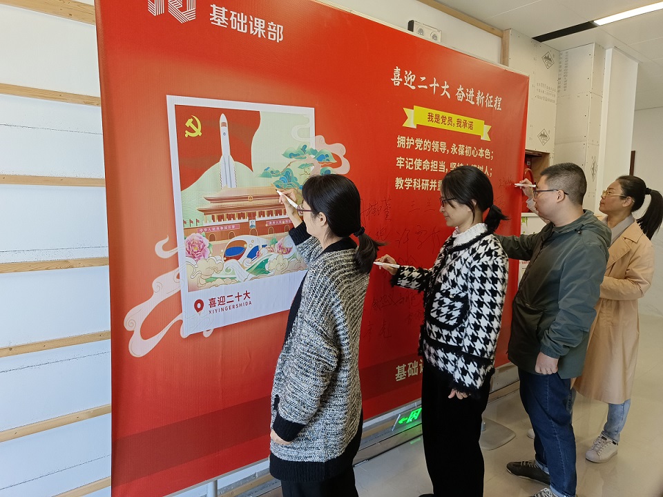 10月11日下午,支部全体党员教师在党旗下庄严宣誓,并郑重承诺:拥护党的领导,永葆初心本色;牢记使命担当,坚持立德树人;教学科研并重,共圆强校之梦。之后,在分管院领导周桂瑾院长的带领下郑重签下了自己的名字。大家纷纷表示,承诺签下的是一个名字,更是一份共产党员的责任和担当,在今后的工作生活中将以实际行动践行承诺。值得一提的是,基础课部的非党员教师得知此事后,也积极在展板上签上了自己的名字,表示要和党员们一起,共迎二十大。