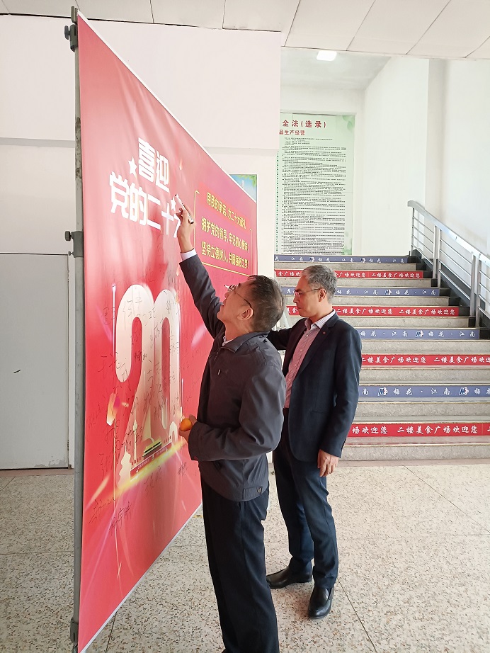 10月12日中午,另一块展板“用我的承诺,为党的二十大献礼”在教工食堂门口展出,院领导和广大教师们纷纷驻足,在展板上签名,接力承诺,携手共迎二十大,共圆强校梦。