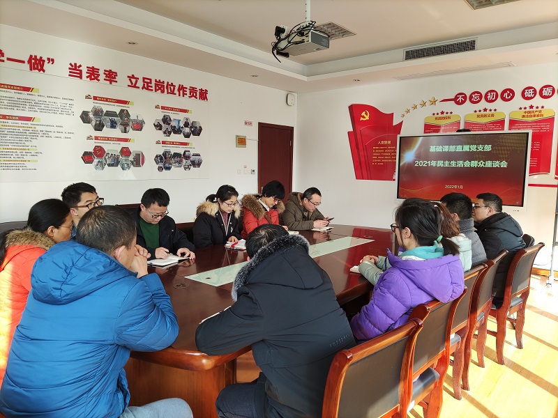 为更好地贯彻习近平新时代中国特色社会主义思想和党的十九届六中全会精神,推进党史学习教育的深入开展。2022年1月12日下午,基础课部直属党支部在明德楼A-215会议室召开了民主生活会会前群众座谈会。会议由基础课部王志萍主任主持。